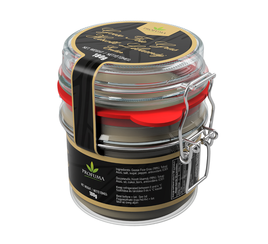 Hízott, erezett libamáj teljes konzerv. Pácolás után hengeres csatos üvegbe töltve. Hőkezeléssel tartósított termék.